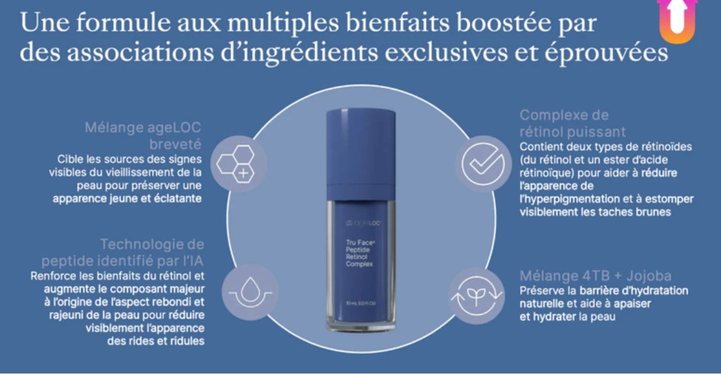ageLOC Tru Face Peptide Retinol Complex accompagne les processus de renouvellement naturels de votre peau pour contribuer à réduire l’apparence des signes visibles du vieillissement de la peau. On parle ici de réduction de l’apparence des ridules, des rides et de l’hyperpigmentation, ainsi que d’une amélioration notable du teint et de la texture de la peau, avec une réduction de l’apparence des pores.